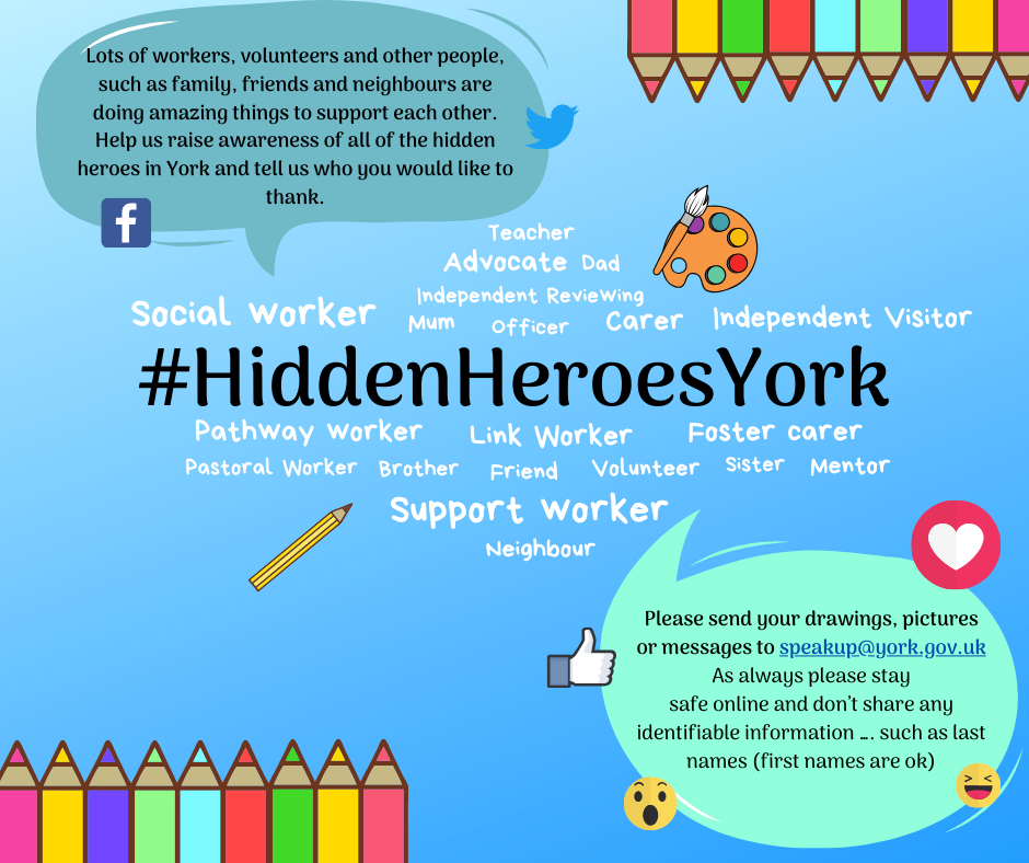 #HiddenHeroesYork The #HiddenHeroesYork campaign are asking children and young people to create thank you messages to social workers, foster carers, mentors, LASPs, CIN workers, school staff and any other workers who are providing support to them during this difficult time. Your challenge is to create poster or message, to say thank you all key workers who...