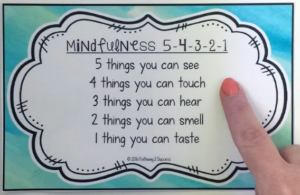 Mindfulness 5-4-3-2-1. Use this technique to ground kids and young adults. This is an especially great activity to help kids manage anxiety or anger. Have students look around their current surroundings and find five things they can see, four things they can touch, three things they can hear, two things they can smell, and one thing they can taste. By the time they get through listing all of those, they will be more present and calm.
