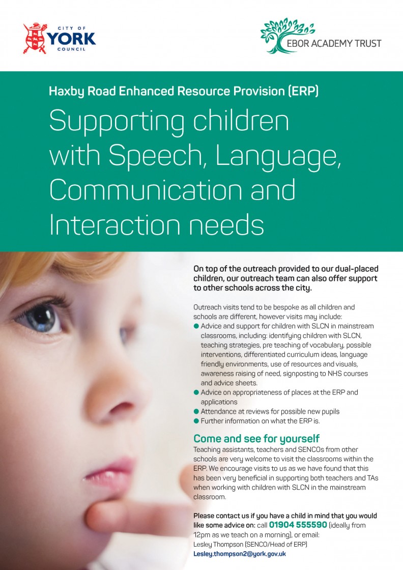 We offer an outreach service as part of our offer across the City of York. This can be for pupils attending the ERP and also for pupils with identified SLCN who do not have a placement with us at Haxby Road. If you would like some advice on strategies you could use, to support with identifying need or advice on whether or not an application for a place at the ERP is relevant, please contact us and we will be in touch.